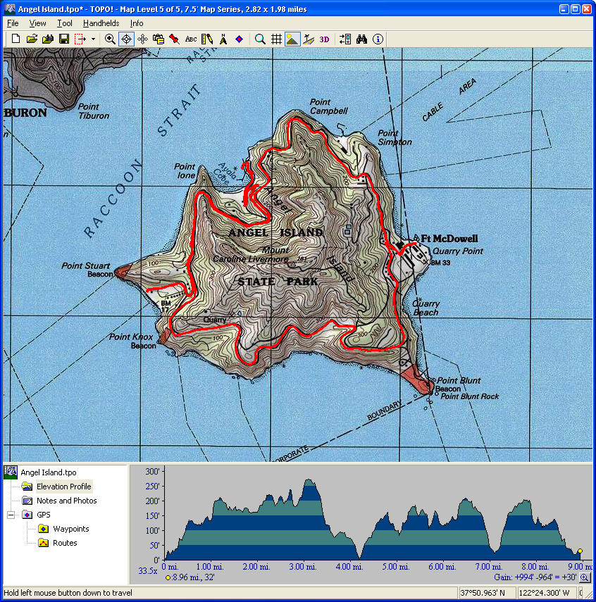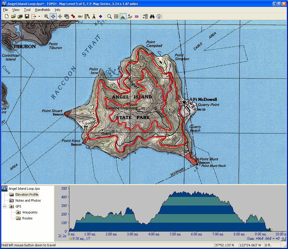 Angel Island Loop (May 11, 2008)Easy ride with mind-blowing Bay views. This traverses all trails open to bikes on Angel Island. The planned route consists of one full loop of the paved Perimeter Road circling the island (6 miles), plus a shorter (3-mile) second full loop at 450 feet of elevation on a fire road. The connection between the two loops is a quarter-mile uphill with about 130 feet of elevation gain. Those who are not up for taking the second loop can easily bypass it and head back to the starting point. We should take the ferry to the island from Tiburon. (The one from San Francisco runs very infrequently.) The links to the website of the ferry service and their parking information, as well as a link to the map of the park are below. The "Parking and Meeting" map I've given below highlights the parking lots shown on the ferry website. I've also repeated the price information from the same page (assuming it's up to date) and added question marks to the ones of which I'm not completely sure. (I really doubt the "Boardwalk lot" is for anyone other than the customers of that supermarket, too.) Ferry service website