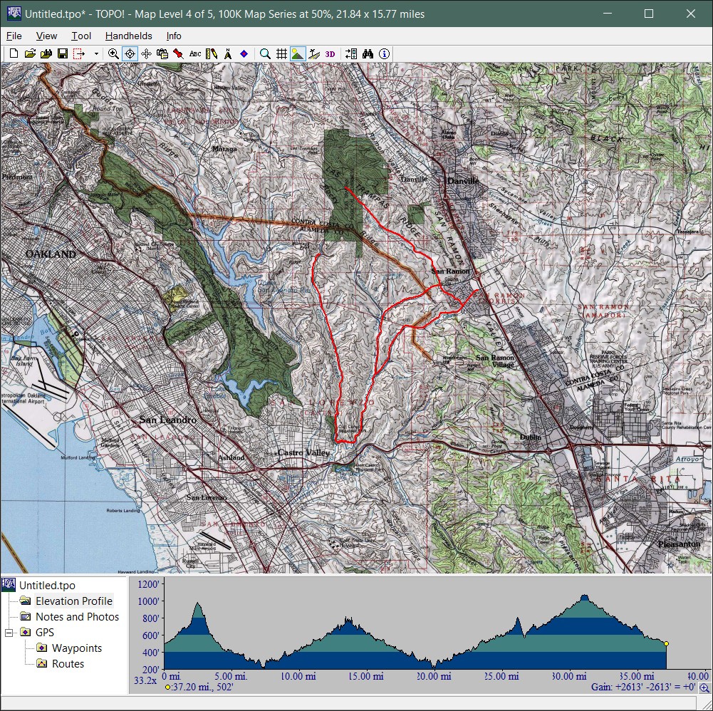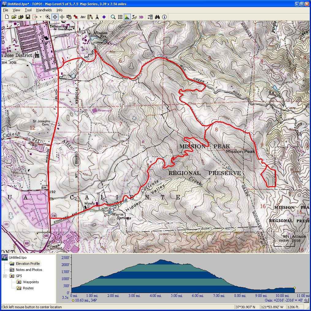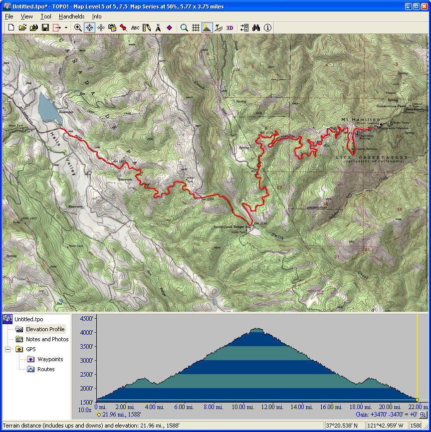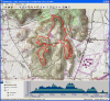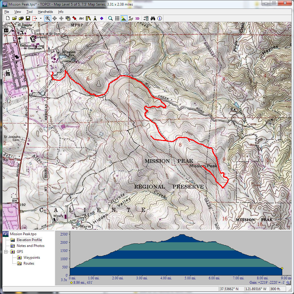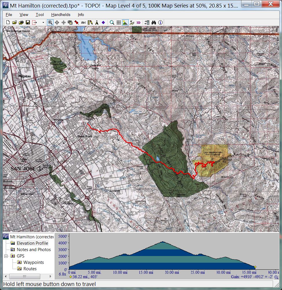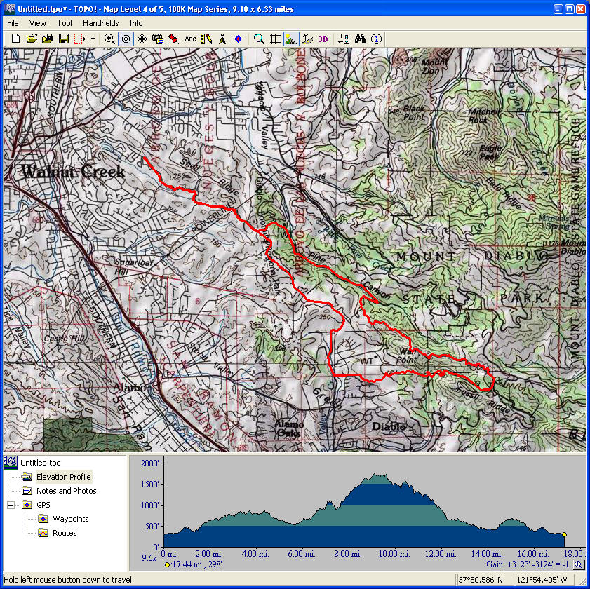 Mount Diablo (September 11, 2010)This is a climb of Mount Diablo from 600 feet all the way to its peak around 3850 feet. It's a route that follows the maximum possible amount of unpaved trails; only a little less than a quarter of the route is on paved road (right near the peak, and only out of necessity). Most of the rest is on fire roads. Only a one-mile section of the route is shown as singletrack on trail maps. The total climb amount of 3800 feet is just an educated guess. The map actually estimates it around 4200, and that may be correct. The climb will be brutal. The climbing portion (of which there is about six miles) averages 9% grade. But there are killer stretches. One stretch longer than a mile averages 13%, and there even seems to be a quarter-mile portion averaging 25%. (The latter might be a map error.) This ride definitely needs to be done during cool weather. So, probably not during the summer.