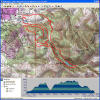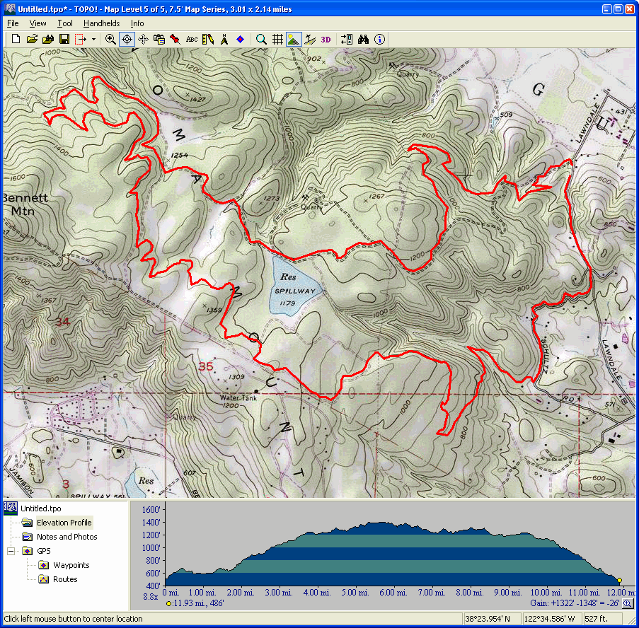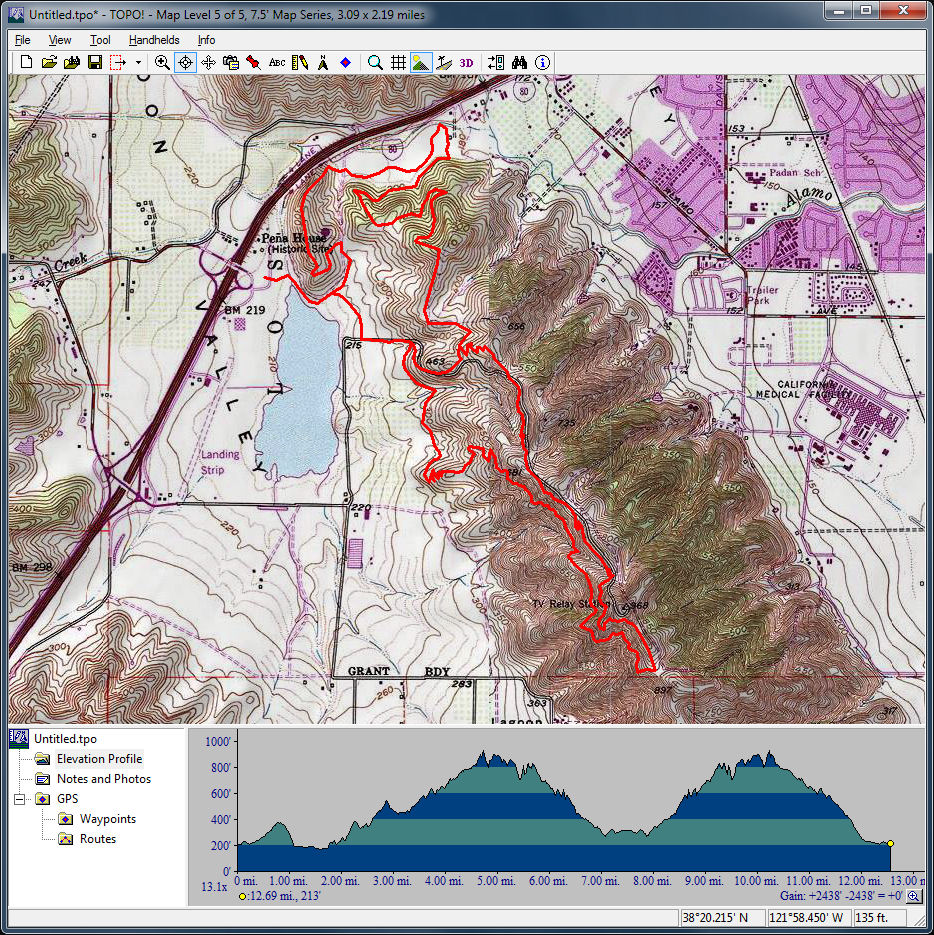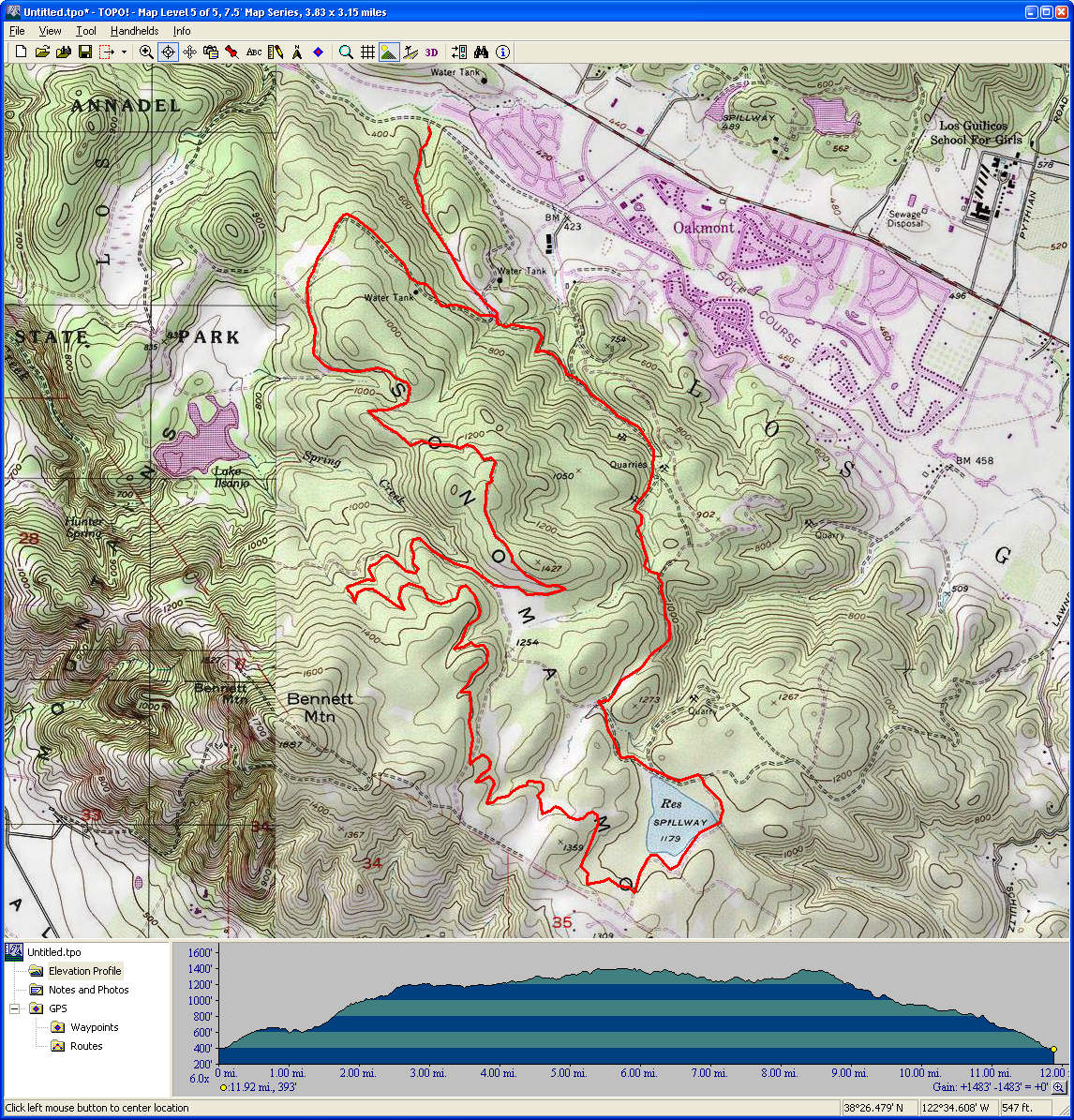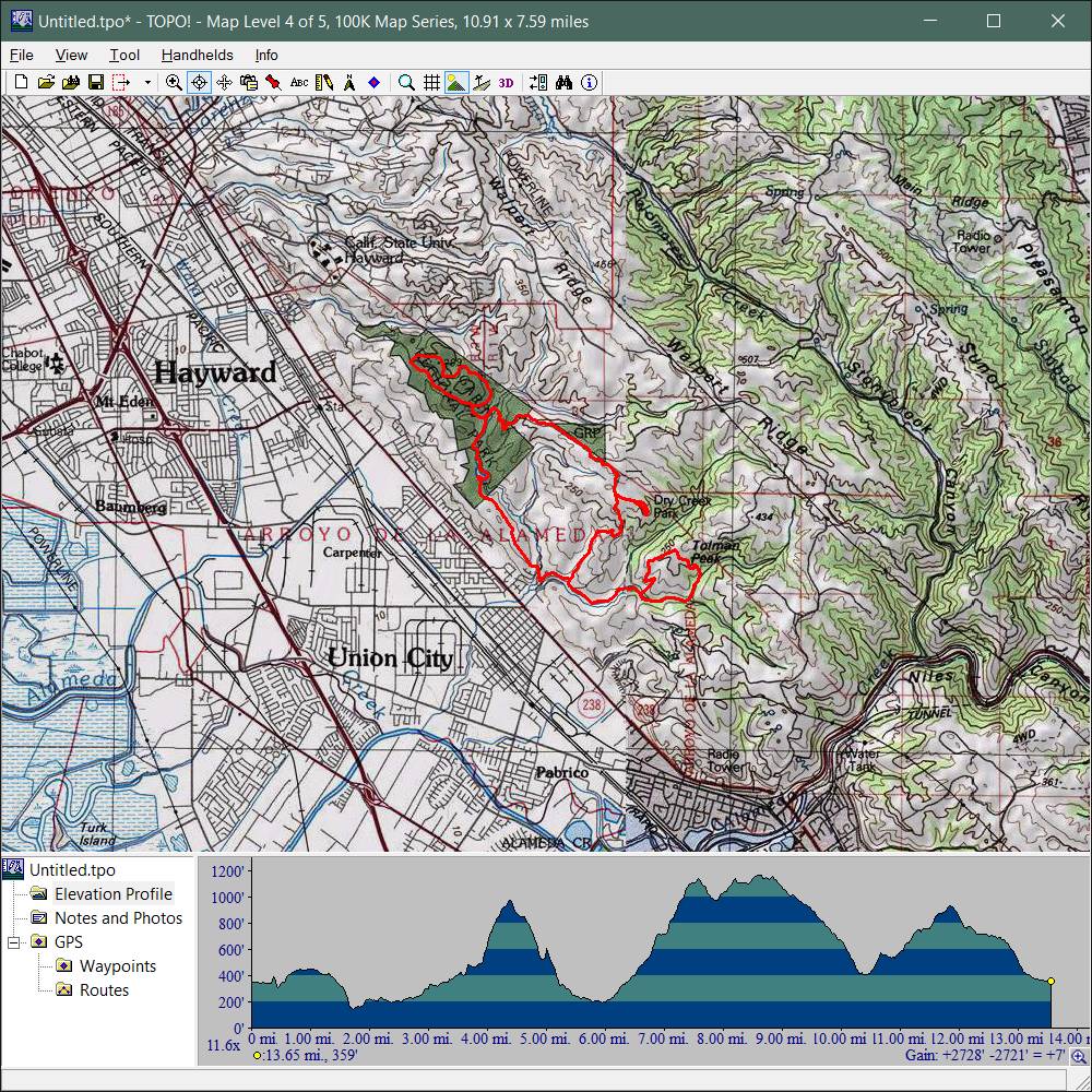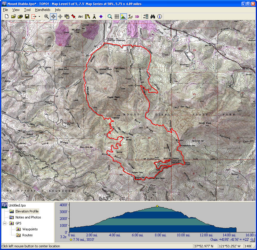 Mount Diablo (September 11, 2010)This is a climb of Mount Diablo from 600 feet all the way to its peak around 3850 feet. It's a route that follows the maximum possible amount of unpaved trails; only a little less than a quarter of the route is on paved road (right near the peak, and only out of necessity). Most of the rest is on fire roads. Only a one-mile section of the route is shown as singletrack on trail maps. The total climb amount of 3800 feet is just an educated guess. The map actually estimates it around 4200, and that may be correct. The climb will be brutal. The climbing portion (of which there is about six miles) averages 9% grade. But there are killer stretches. One stretch longer than a mile averages 13%, and there even seems to be a quarter-mile portion averaging 25%. (The latter might be a map error.) This ride definitely needs to be done during cool weather. So, probably not during the summer.