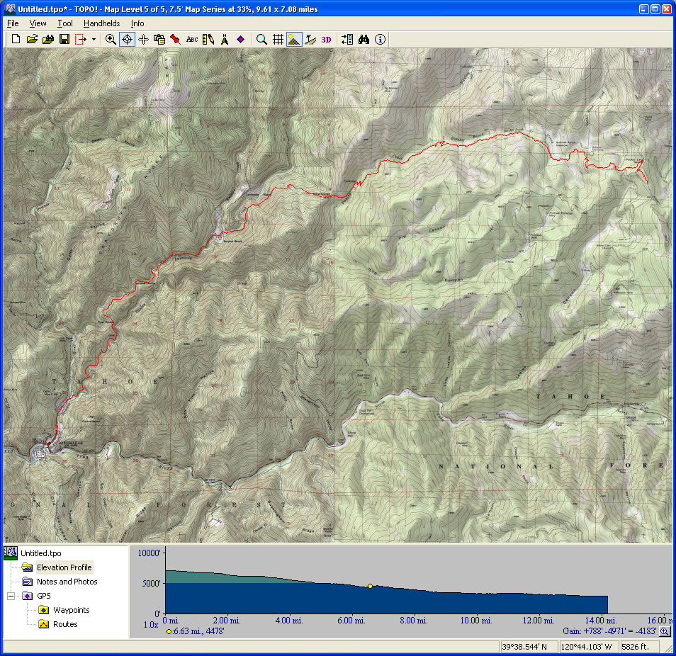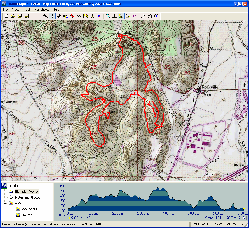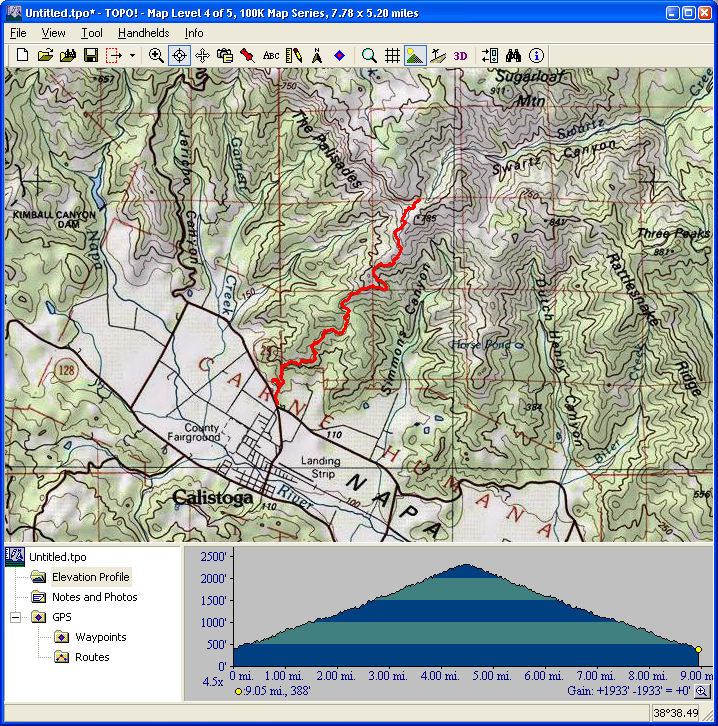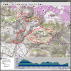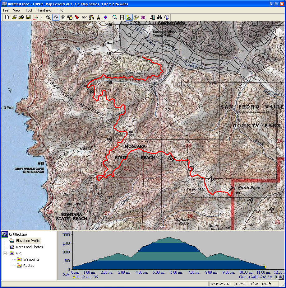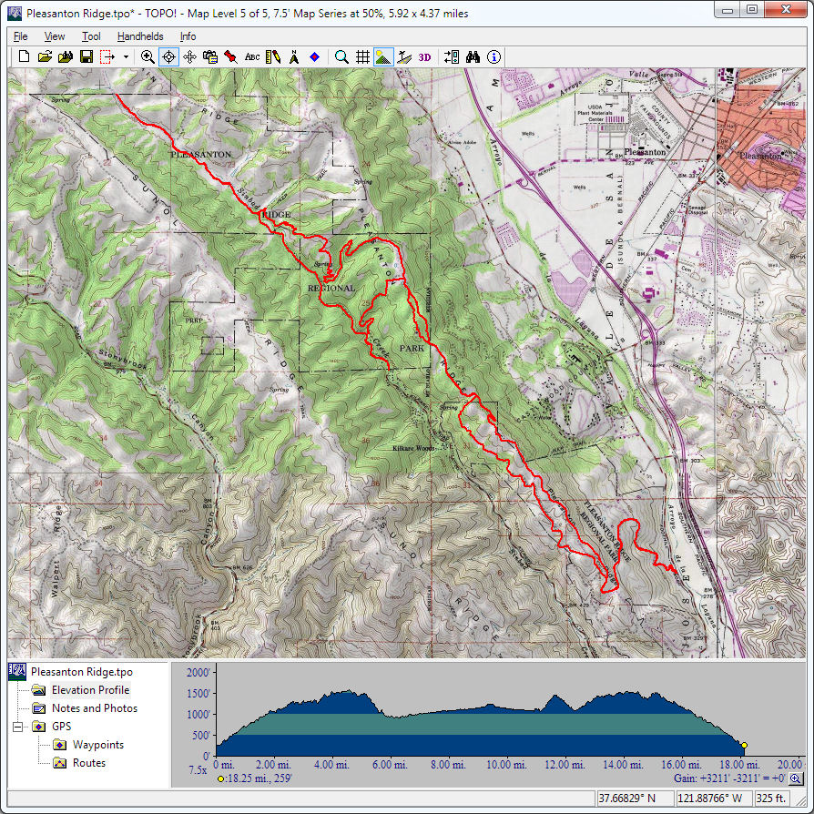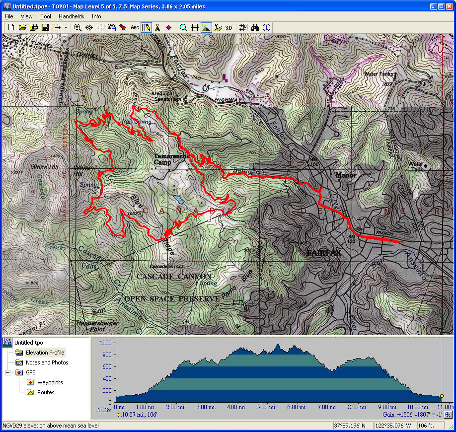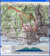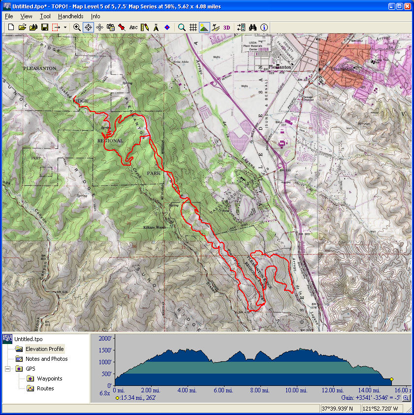 Mount Diablo (September 11, 2010)This is a climb of Mount Diablo from 600 feet all the way to its peak around 3850 feet. It's a route that follows the maximum possible amount of unpaved trails; only a little less than a quarter of the route is on paved road (right near the peak, and only out of necessity). Most of the rest is on fire roads. Only a one-mile section of the route is shown as singletrack on trail maps. The total climb amount of 3800 feet is just an educated guess. The map actually estimates it around 4200, and that may be correct. The climb will be brutal. The climbing portion (of which there is about six miles) averages 9% grade. But there are killer stretches. One stretch longer than a mile averages 13%, and there even seems to be a quarter-mile portion averaging 25%. (The latter might be a map error.) This ride definitely needs to be done during cool weather. So, probably not during the summer.