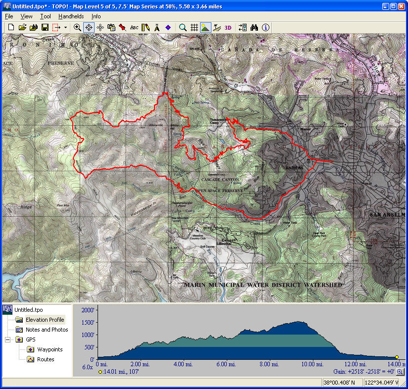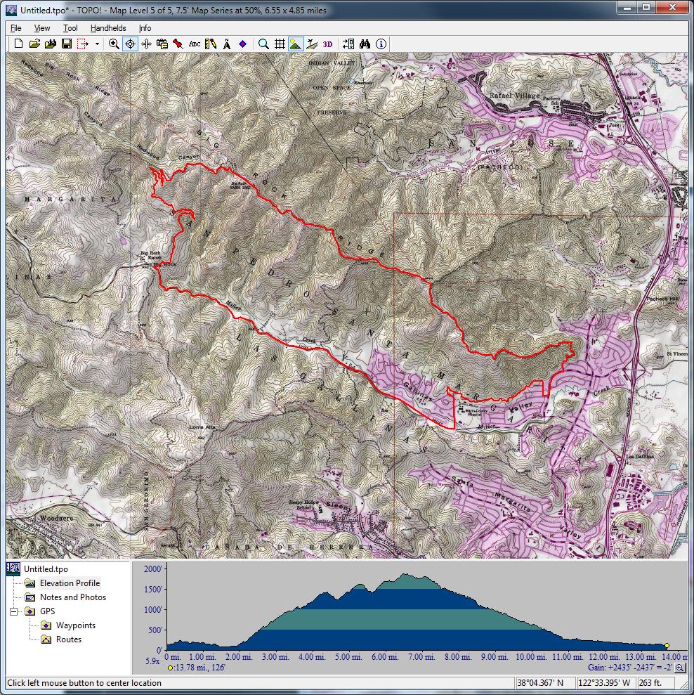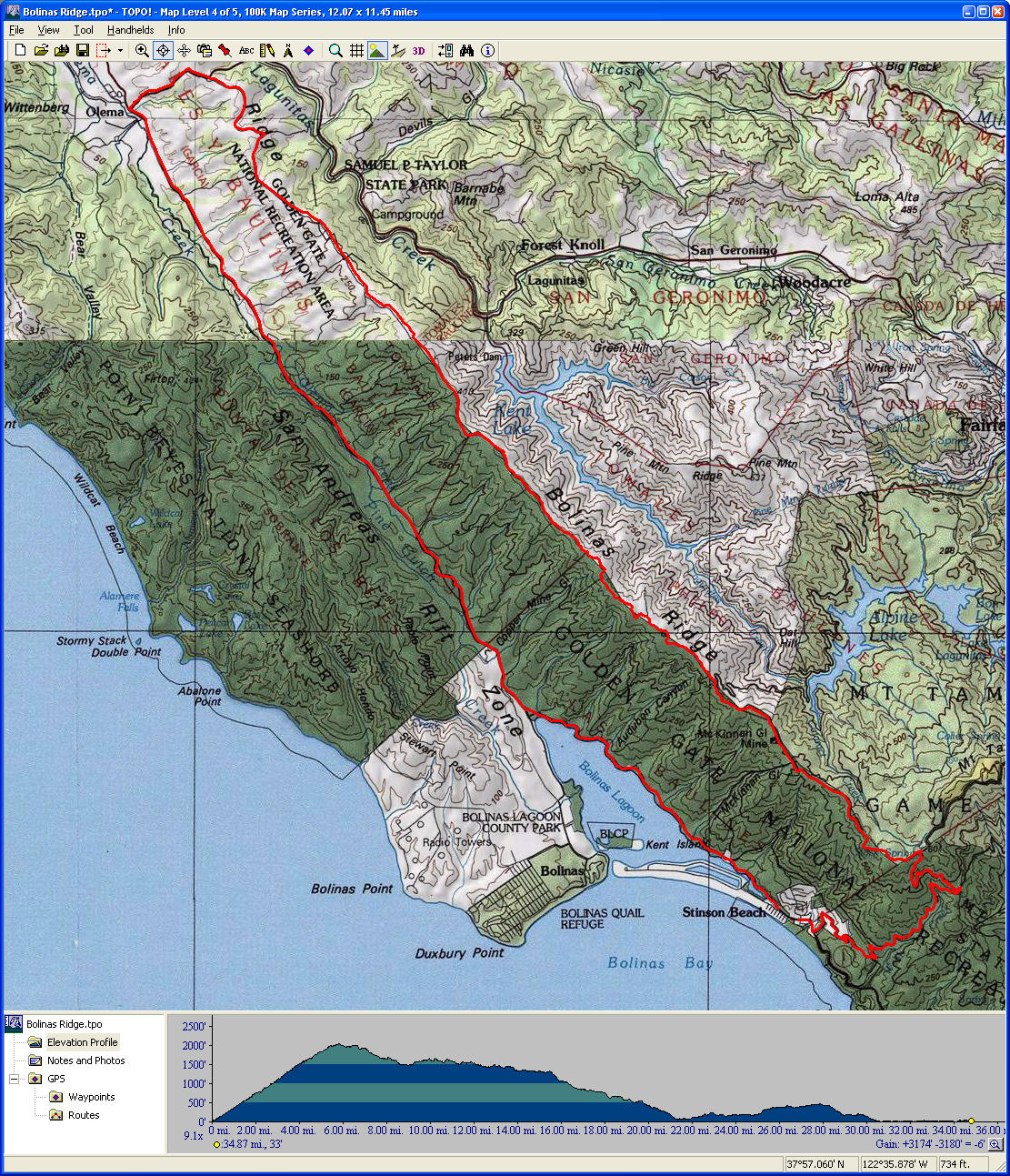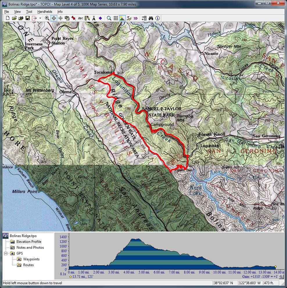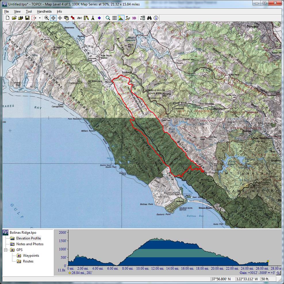 Bolinas Ridge (longer version) (April 17, 2016)This is a ride to try out more of Bolinas Ridge Trail. The ride includes the entire trail (which is 11 miles in length) traversed in a descending direction. The ride includes 10.5 miles of road riding, nearly 4.5 miles of this in the form of a climb with about 10% average grade, which is the only climb on the ride to speak of. The ride also includes a 5-mile trail segment paralleling Highway 1 that is often overlooked, some of which is singletrack.
