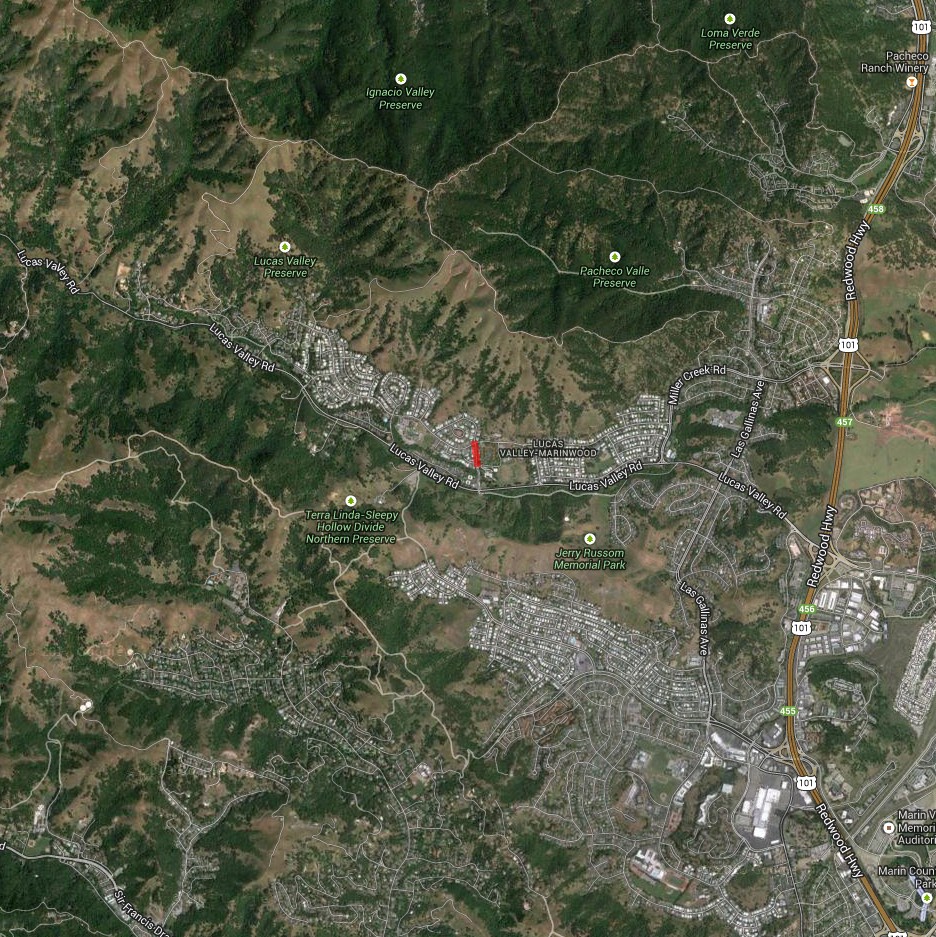 Big Rock Ridge (May 16, 2015)The aim of this ride is to sample one of Marin's rare bike-legal singletrack trails and the last one we haven't tried yet: Big Rock Ridge Trail. This is a 2.5-mile descent (when done in this direction). The first half of the ride is a fire-road climb (with a number of ups and downs, unfortunately). Thankfully, there is little tree cover during most of this climb that follows the spine of a ridge, so the views to the surrounding Marin towns and to the bay should be panoramic all the way. The ride does include a 3.5-mile road segment at the very end, though.