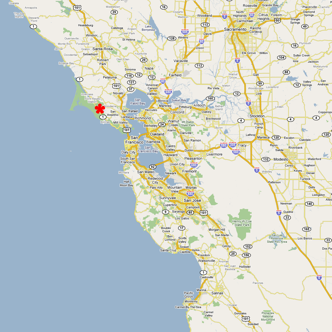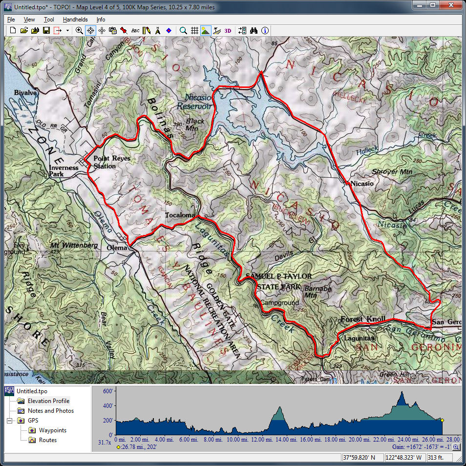 Nicasio Reservoir Loop (March 8, 2014)This is an excellent option as a modest but scenic road ride. It features very little climbing. The scenery should be a mix of rolling velvety (in the green season) hills of Marin with short stretches of redwood groves. Highlights of the ride include passing through the cute tourist town of Point Reyes Station, and a handful of "barely hamlets" like Olema (population: 55) and Nicasio (population: 96). Other than some weekend traffic on the Highway 1 stretch of the ride (less than 2.5 miles) and perhaps a little on the Francis Drake Boulevard segment (10 miles), I expect the roads through much of the ride route to be semi-deserted. Notice that the map of the route shown here represents the ride as starting from Nicasio (it's really only significant for the elevation profile plot), but it would probably be a better idea to start it from Point Reyes Station instead (as represented by the parking link), so that some good food and coffee options will be right under hand as soon as we finish the ride.