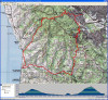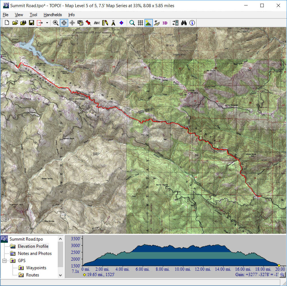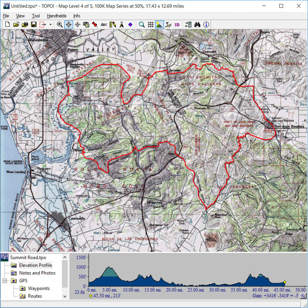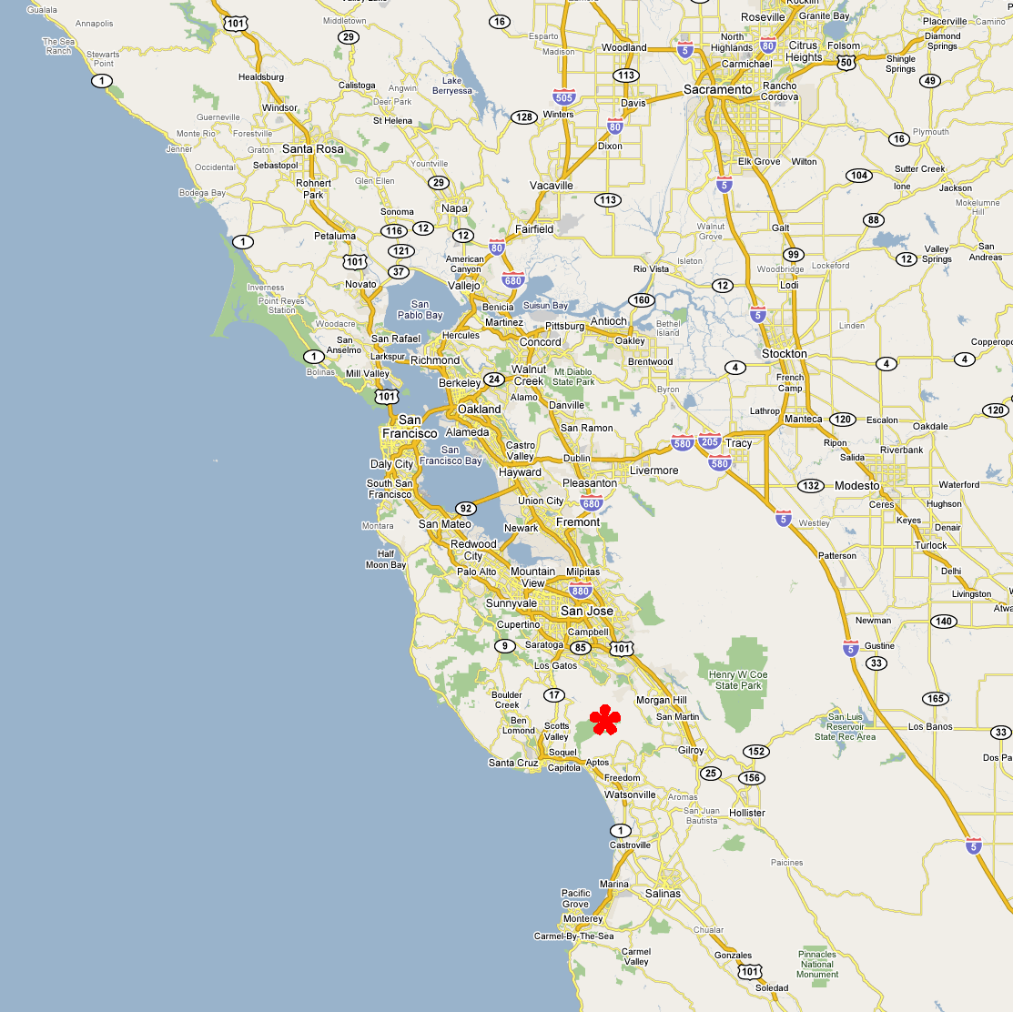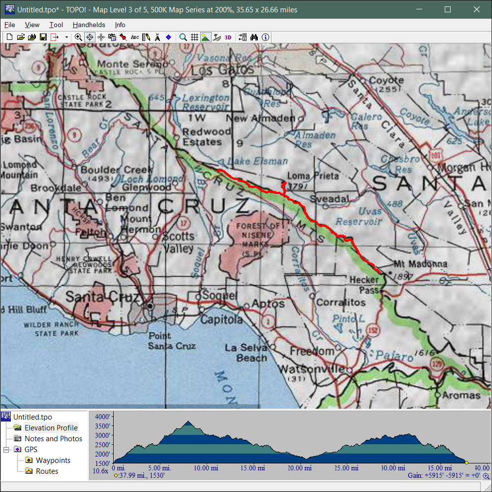 Summit Road (May 28, 2016)This one is an unusual option. It's a bit of an "exploration on bikes". This is a road that I had assumed (along with many other people, apparently) to be a private one ever since I moved to the Bay Area. I recently read that it's not, despite signage to the contrary that's still up. This immediately made me want to try a bike ride on it. I've read good things about the expansive views. Virtually the entire route takes place along the spine of the highest ridge of this section of the Santa Cruz mountains and passes right by the Loma Prieta peak. Views are reportedly available toward the San Francisco Bay as well as Monterey Bay, sometimes simultaneously. This is really a "road ride" but long segments of this road has a gravel or dirt surface. So, the ride needs to be done on mountain bikes (or maybe I should say "trail-capable bikes"). Incidentally, despite the name, this road has nothing to do with the Summit Road that intersects Route 17. In these stats for the ride, I've included a side trip to the top of the Lome Prieta peak. Depending on whether we include it, the ride length could range between about 34 and 38 miles. And, since it's an out-and-back ride, we can further shorten the route, if necessary, by picking a different turn-around point. Meanwhile, the total climb estimate for the ride is a rough one. The 5900-foot climb figure seen on the screenshot for the ride's topographic map is certainly a gross overestimate. The real number is almost guaranteed to be less than 4000 feet, and would be substantially less if we leave out the Loma Prieta side trip. There's also a decision to be made about the starting point of the ride. I've pointed out the northwestern end of the ride as the starting point here. This is a roadside parking spot along Summit Road (the one off Route 17), near Summit Store. It's a spot with plenty of car traffic but no pedestrian presence. We need to decide if we feel that will be safe enough. The other option is to start the ride from its southeastern end by parking in the Mount Madonna County Park.
