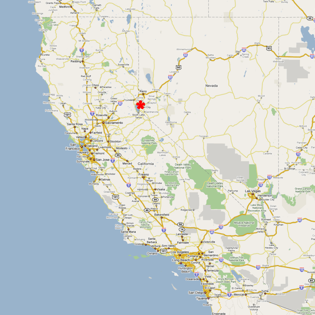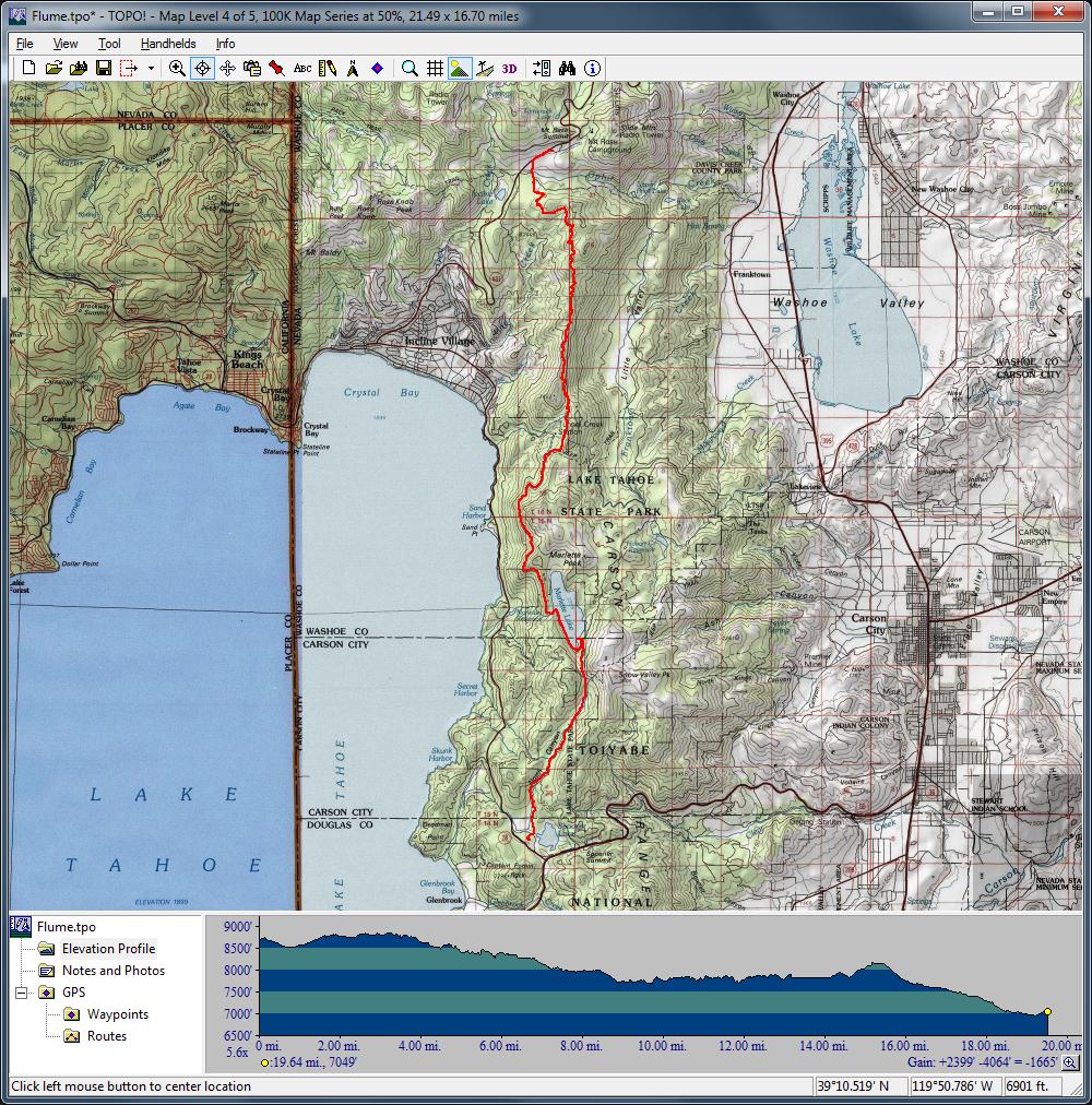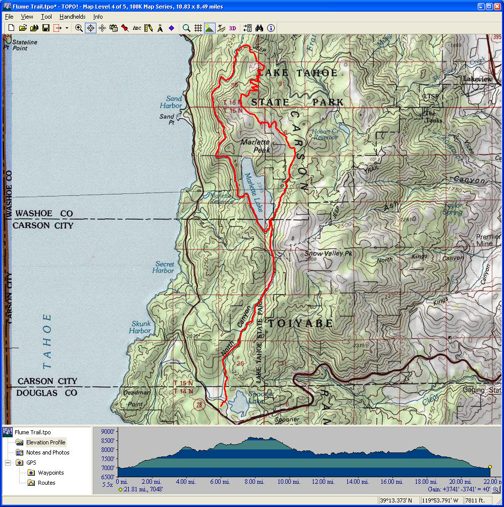 Flume Trail (August 4, 2012)This is another ride that requires an overnight stay. Flume Trail is arguably the most famous mountain biking trail in the Lake Tahoe area, though it's not because of its technical merit or challenge, but more for its setting and scenery. It's roughly a four-mile trail carved almost perfectly horizontally into the face of a steep hillside overlooking Lake Tahoe. (The topographic map seems to imply that it used to be an aqueduct.) I've encountered the difficulty of Flume Trail itself described as "can be handled by any 13-year-old". That must be as long as you don't mind the risk of your 13-year-old tumbling a few hundreed feet down if he veers of by more than a few feet along some stretches. This is not a shuttle ride; it ends where it starts. It initially climbs about 1600 feet in eight miles, making a loop around Marlette Lake (a reservoir that's "just over the ridge" from Lake Tahoe). Flume Trail is traversed on the return half of the loop around Marlette Lake. There's also about a one-mile stretch that follows right along the edge of the Marlette Lake coast. So, this won't be a ride where our mountain biking skills will be challenged or improved, but it's likely to be the most scenic ride we've ever done. You can find a zillion photos of the trail and its views if you do a Google image search for "flume trail", but the following photos are some of the better ones in terms of showing the general area traversed by this ride (the smaller body of water in all photos is Marlette Lake, which is looped during this ride): A general park map showing the trails along with some more details of what else is around and the amenities along the way, is here: Lake Tahoe Nevada State Park map