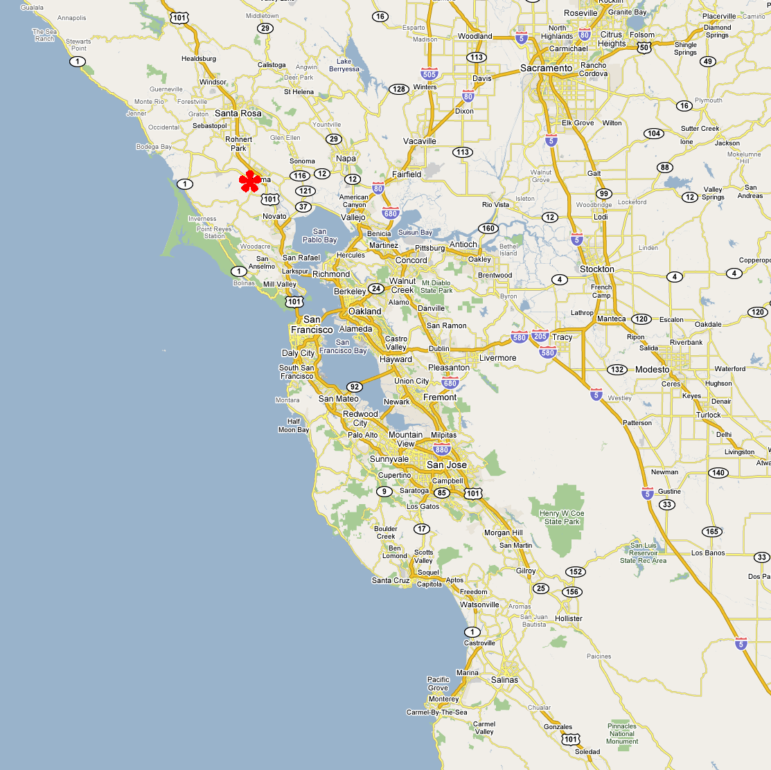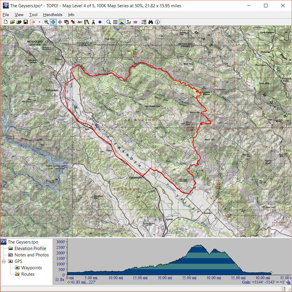 The Geysers Loop (April 9, 2017)I read about this ride being called a classic road ride loop of Sonoma County and one of its best. It's described as being "challenging". That's challenging despite being "only" a 47-mile ride. So, along with the drive time to get there, this one is likely to end up an all-day affair. One recurring theme about this ride appears to be "remoteness". Its location is not exactly "right around the corner" to begin with, and it traverses dozens of miles on back roads in the mountains far from even the tiniest settlements. The ride begins right by Highway 101 and follows it very closely for quite a few miles, but then turns away and heads into the mountains in the northeast where most of its mileage as well most of its work takes place. By the way, there aren't any geysers to be seen on this ride. The ride appears to be called what it is only because it begins from Geyserville and it traverses an area of geothermal power plants (along Geysers Resort Road), which I think we'd get to see from across the valley (but not up close). If we're lucky, we might get to spot some steam plumes that these plants might be emitting, but that's about it.