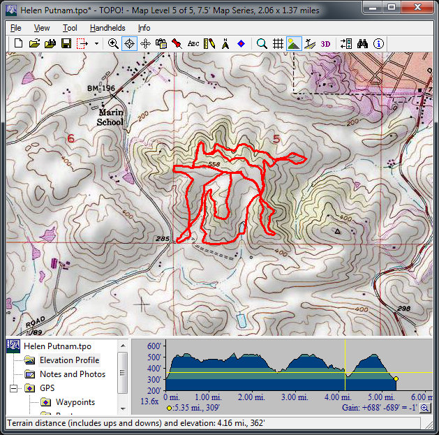 Helen Putnam (July 16, 2011)This is easily the shortest ride ever to be on this list. It's an all-trail ride in a small park near Petaluma. It's very short, but the book I got this from described it with phrases like "five-inch-wide singletrack, tight turns, no extended climbs, rapidly changing scenery" and used the tag line "don't stop 'til you get enough!" So, the idea is to do multiple loops here. (The numbers below are for a single loop.) In addition to repeating the loop shown below, the park has about 3.5 more miles of trails in its modest web, almost all of them singletrack. It looks like this park is a hidden little gem of our area that we should all be familiar with.