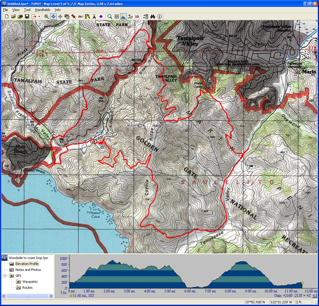 Golden Gate Bridge and Marin Headlands (January 19, 2009)This is a ride that's probably done more by tourists than by local bikers, but any biker who lives in the Bay Area should do it at least once. It's completely a road ride. The route starts from Crissy Field, crosses the Golden Gate Bridge, climbs up Conzelman Road, visits Rodeo Lagoon and beach, pushes to Sausalito for a snack and coffee break, and returns. The highlights include people (and dog) watching on Crissy Field (at least on the return), crossing the Golden Gate Bridge by bike, views of the city from Marin Headlands, the view that opens up suddenly with the steep descent toward Point Bonita, riding through a half-mile tunnel on bikes, and relaxing at Cafe Trieste. When looking at the ride's elevation profile, keep in mind that the topographic map doesn't know about the bridge or the tunnel, so it assumes you follow the surface along those stretches and, therefore, causes an error of about 500 feet.