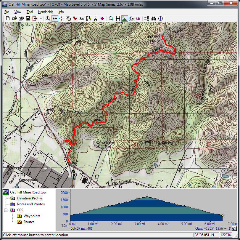Oat Hill Mine Road (September 24, 2011)Known as a tough and very technical mountain bike ride, this road used to be the supply road to a mine, as its name suggests, back in the 19th century. Nominally, it's an all-fire-road ride. But, if there ever was a technical fire road, this is it. For those familiar with Eldridge Grade, my guess is that this is like "Eldridge Grade x 2". The climb is about 4.5 miles long and the average grade, being pretty even, comes to about 8%. But, don't let that number cloud your assessment of the trail's difficulty without seeing the photos and videos: The Ogre's Guide (don't miss the other pages of photos and videos, accessible under "Links") Don't let the most radical photos scare you, though. I'm pretty sure the worst ones are likely to have been taken on obstacles and stunts that are near the road. (Concrete stairs? Oh, come on! This road was used by horse carriages!) The ride shown below is actually the typical minimum that people seem to do. This can be extended to 12 or 23 miles by just delaying our turnaround point, moving even closer to where the actual Oat Hill Mine used to be. We can continue on for as far as we feel like on this ride, but there isn't much serious climbing after the portion shown below. My time estimate below factors in the technical difficulty of the climb and attempts to account for the "let me try that section again" allowances.