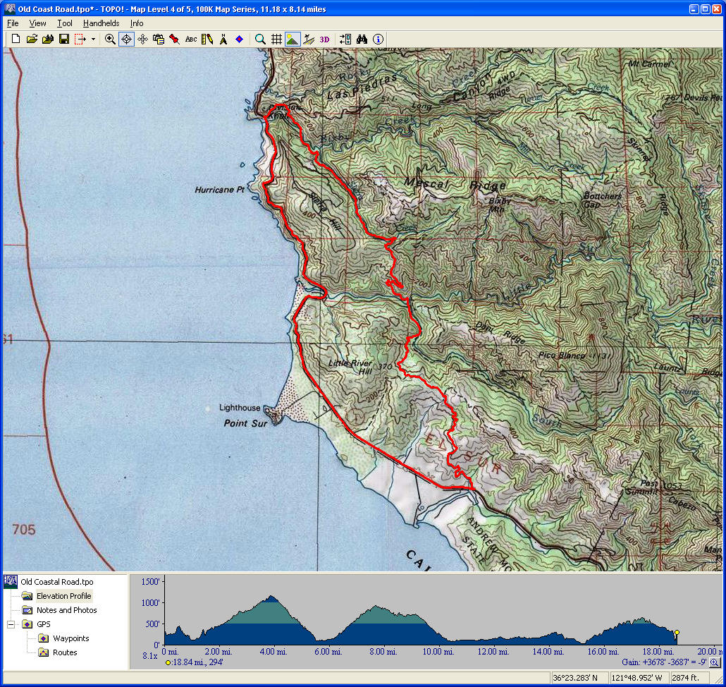 Old Coast Road (July 7, 2012)The Old Coast Road follows the course that Highway 1 used to take (up to 1932) until the Bixby Bridge was built. (Bixby Bridge, for those who may not be familiar, is the most iconic sight on the stretch of Highway 1 along the Central California coast.) The portion of the ride on Old Coast Road is all fire road with no shortage of climbing. A little less than half of the ride is the return on the pavement of Highway 1 back to the starting point. This ride is widely described as very scenic, but don't expect the inland half of the ride to have constant views to the ocean (though it does have some occasionally). It's not a very interesting ride from a technical viewpoint, but it's a reasonable choice for a first ride to try near the Big Sur area, and is among the widely known mountain biking routes near the Bay Area. The selling points are the scenic mountains, valleys, and forests; the views to the ocean; the remoteness (real wilderness); and a long stretch of riding on curvy Highway 1. If you need more information to convince yourself about this ride, there are links below to two other sources where it is described. Both of these describe a counter-clockwise loop, though. I prefer the clockwise loop, because the climbs are a little milder. (We'll be going against the prevailing winds on part of the stretch on Highway 1 this way, but I'd rather take some headwind while pedaling on a 2% average grade, rather than having to reach the highest point of the ride on a 12% average grade instead of an 8% average...) Pedal! Damn it! blog posting (tons of photos)