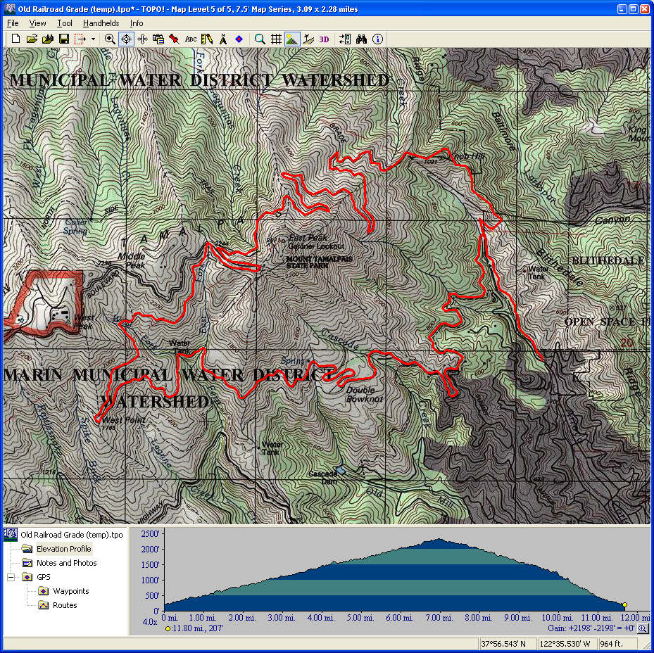 Old Railroad Grade (February 21, 2009)This is a climb from around 200 feet of elevation to the peak of Mount Tam. It consists entirely of fire roads. The ride provides a sampling of spectular views in every direction from high on the mountain. If it's a clear day, it's like a view from a plane. If it's a foggy day, you experience the unique experience of climbing through clouds to reach views of Bay Area ridges jutting out of a "white and fluffy ocean". The climbing portion of the ride is on Old Railroad Grade. This is the route of the railroad that used to reach the peak of Mount Tam. The most interesting part of it is its history. You get to see a rare "trail" for which hills have been cut through, get to see the site of an old station, visit West Point Inn, and see the Double Bowknot (a series of four hairpin curves). Since this used to be a railroad, it also has a very steady average grade of less than 6%. So, this may be easiest way to climb up a mountain in its entirety on a bike. The downhill part of the ride is on Eldridge Grade, possibly the rockiest trail you can find in the Bay Area. It may make hardtrail riders wish they had full-suspension bikes. It's described as not being for beginners, and the trail used to be open only to uphill mountain bike traffic until comparatively recently. So, basically, it's a blast! This is a ride Ali and I have already done (twice, actually) and Han traversed Eldridge Grade uphill. But it's beatiful, not too challenging, and the descent on Eldridge Grade is something we wouldn't want anyone to miss. The five-hour estimate for the ride also takes into account taking our time and taking in the views.