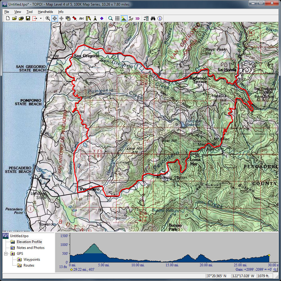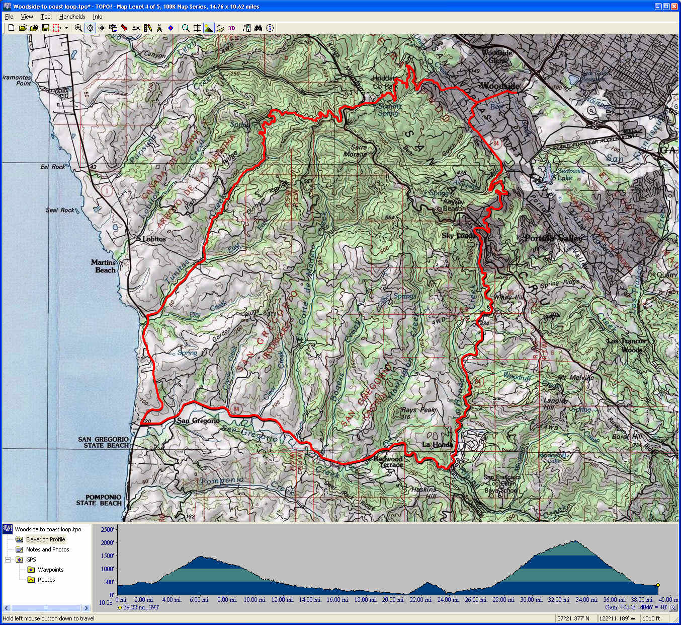 Woodside to the Coast Loop (December 5, 2015)This ride is to fulfill Han's idea of starting out on the Bay side, crossing the Santa Cruz Mountains all the way to the sea, and crossing them back again to get back. This seems to be the shortest and easiest route that would achieve that. It's completely a road ride.