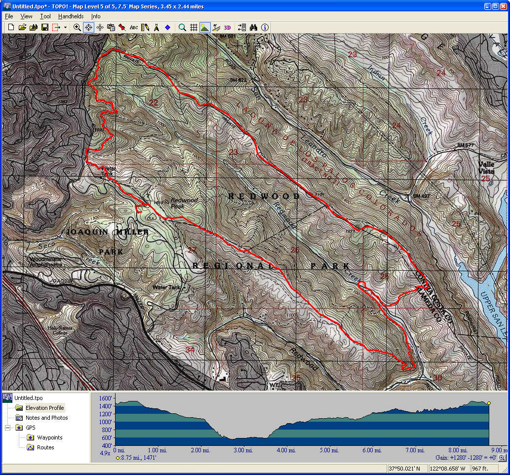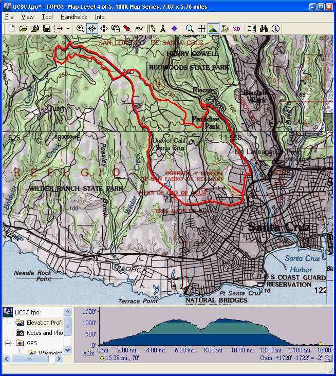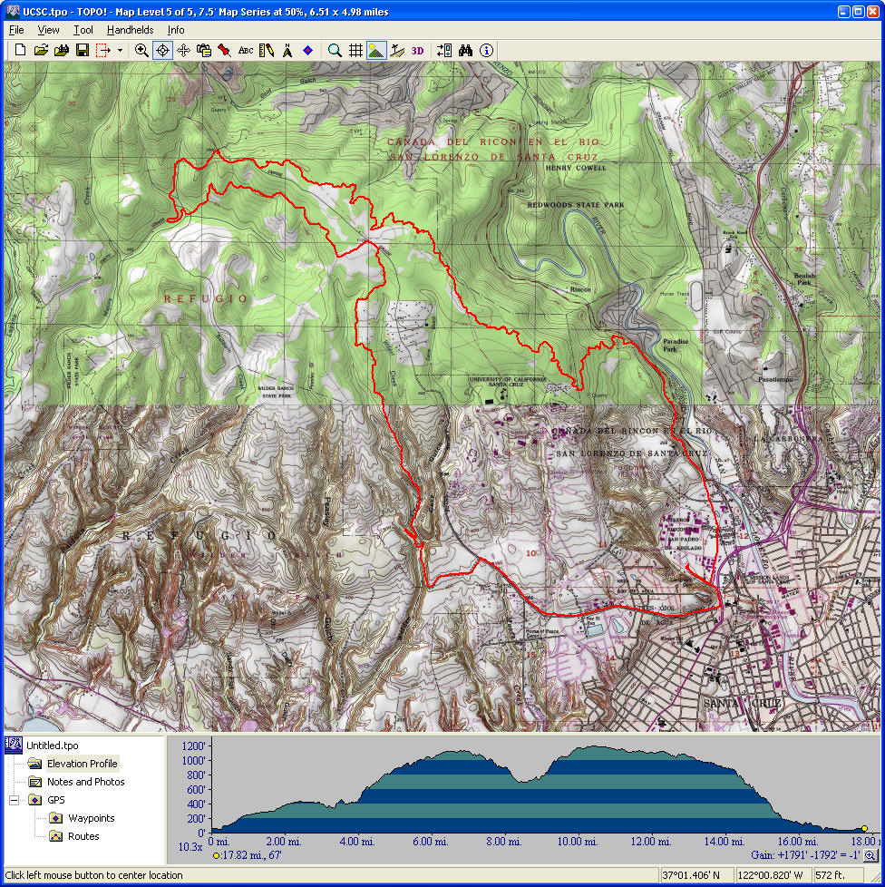 UC Santa Cruz (May 17, 2008)This includes some road sections, some fire roads, and some singletrack. The climbing is mostly on roads, and the descents are mostly on trails. (A good combination.) This passes through some of the upper reaches of Wilder Ranch, some UC Santa Cruz lands, and the Pogonip Preserve.