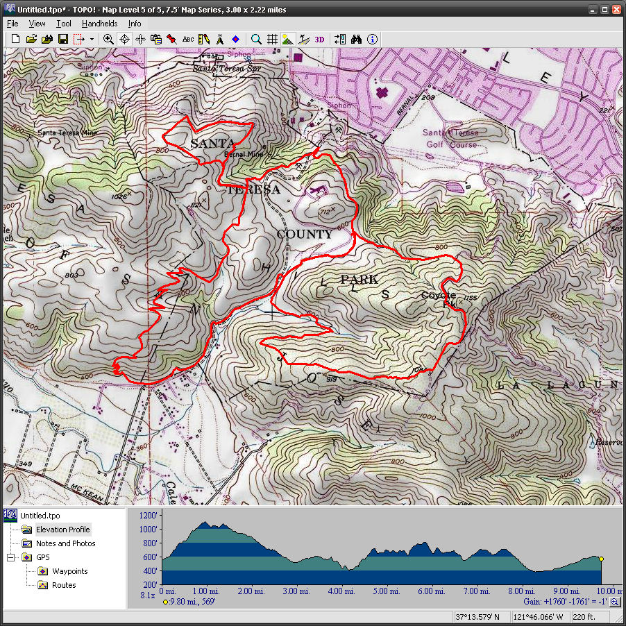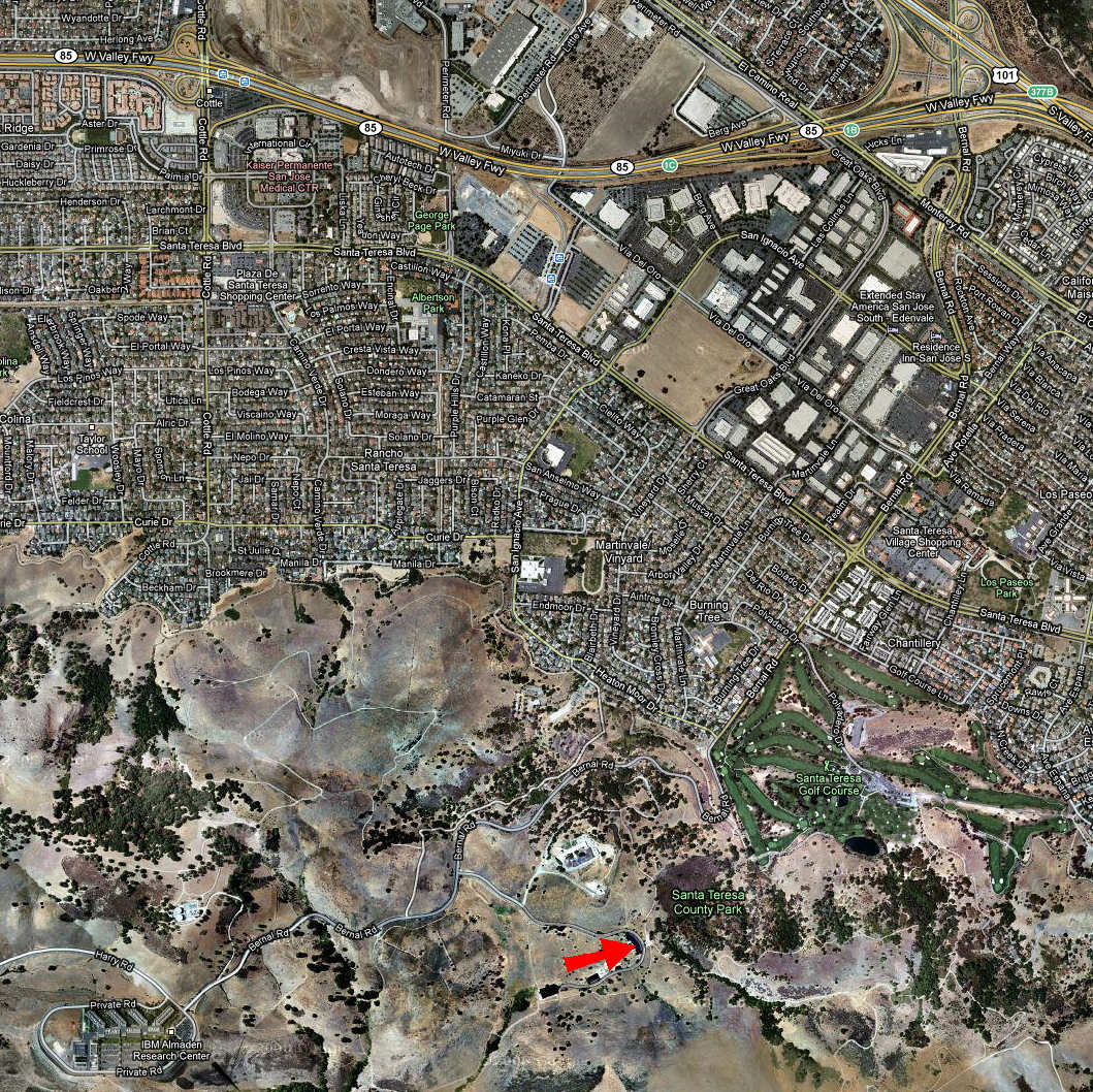 Santa Teresa County Park (May 22, 2010)This is a ride that's in a curious location in relation to most rides that we do. It's in South San Jose. The ride is a mix of fire roads and singletrack. This route is described as traversing all of the park's singletrack trails. (At least those that are legal for bikes.) By a rough estimate, I would say that two to three miles of the 10-mile ride is singletrack.