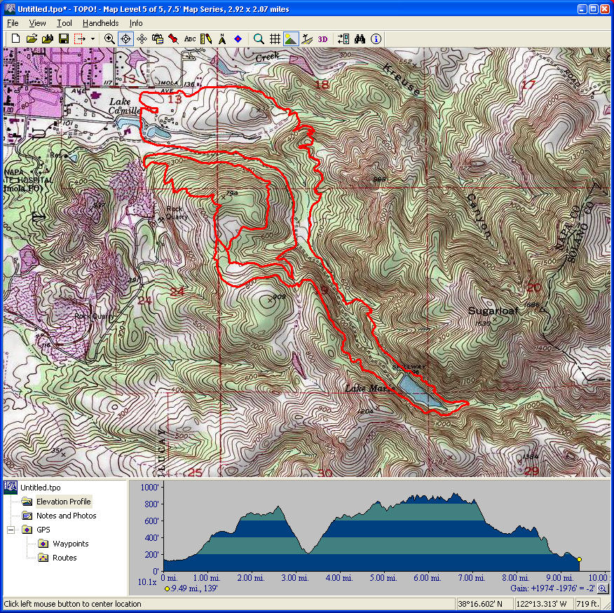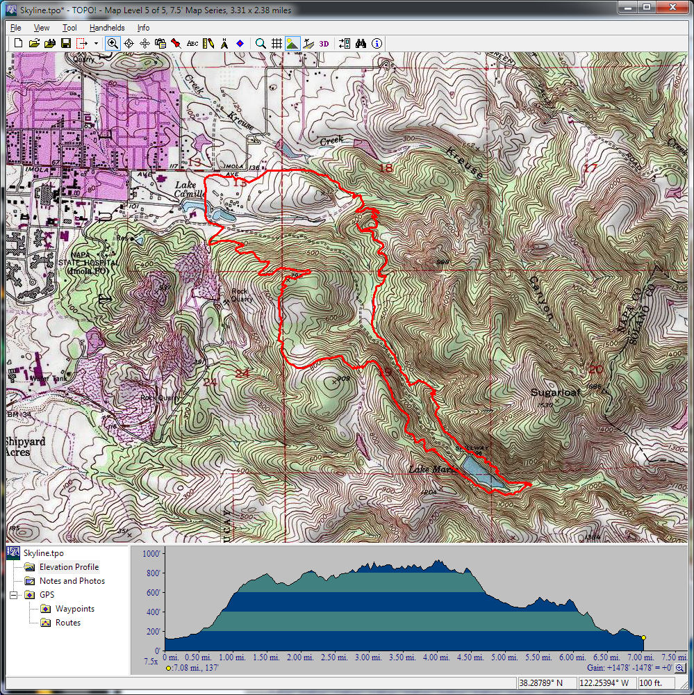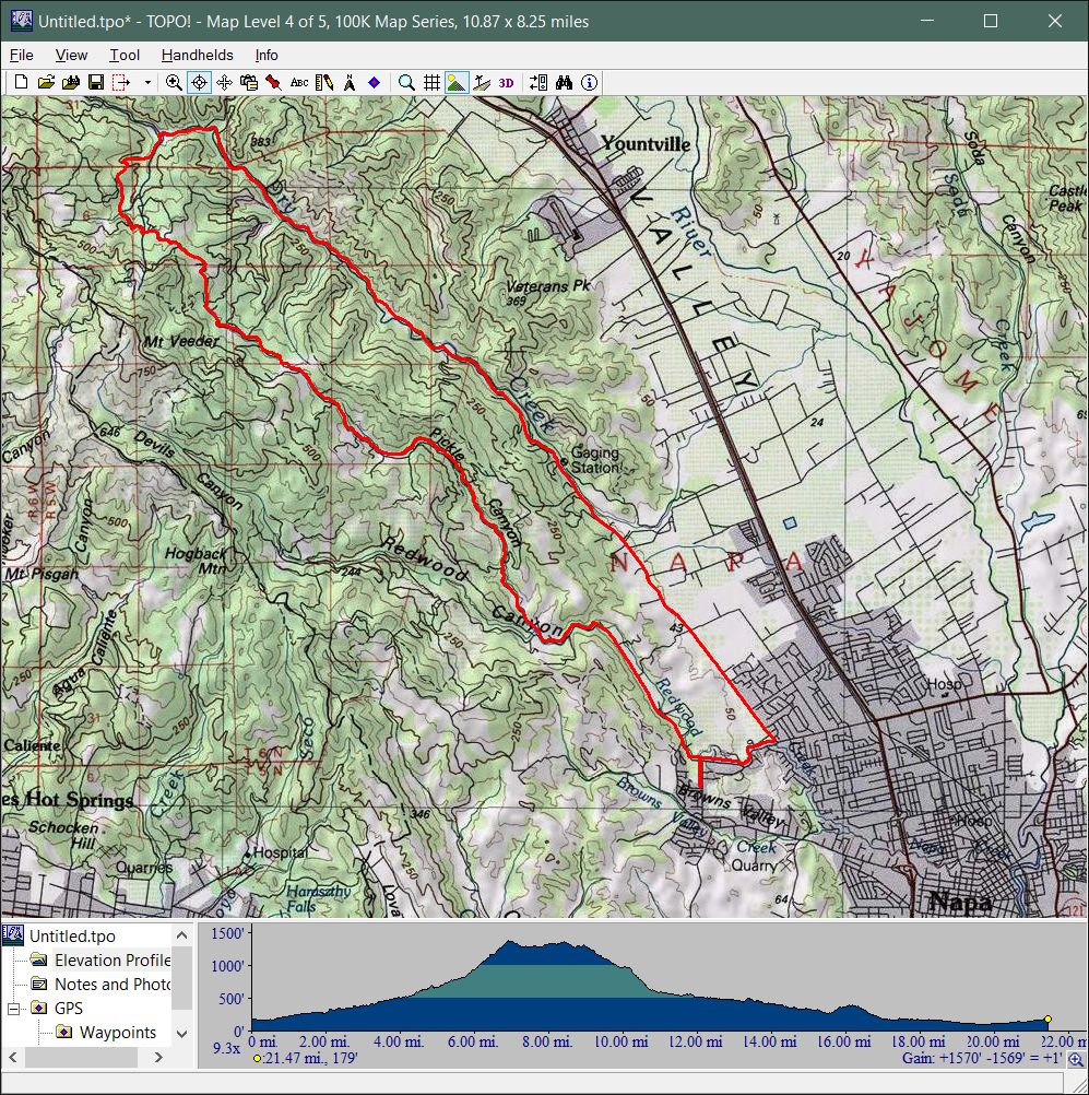 Mount Veeder Road (March 26, 2016)Mount Veeder Road is a road cyclists' favorite near Napa. It's a nice and leafy mountain road. As far as I understand, it's secluded, pretty, and has almost no traffic. When traversed in this direction, it's a gentle climb that slowly picks up in steepness. The climb doesn't become serious before the last 1.2 miles to the top. That portion is going to be tough, with grades averaging over 10%. After traveling for another couple of miles mostly flatly beyond that point among some vineyards scattered around the higher elevations, the road descends (steeply, in the latter parts) toward the busier Dry Creek Road. The route returns to its beginning on this wider and much flatter road with an imperceptibly descending grade, in the presence of more typical wine-country traffic. This is the shortest route that would allow a full traversal of Mount Veeder Road (not counting a plain out-and-back).