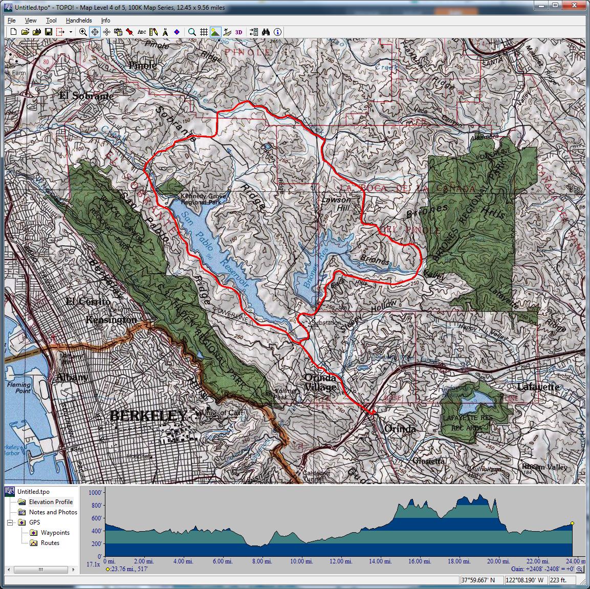 East Bay Canyons (February 20, 2016)This is a road ride aimed at exploring two canyon roads in the East Bay that appear to be pretty popular with cyclists; Cull Canyon Road and Bollinger Canyon Road. Since both of these are dead-ends, the ride route is in this awkwardly sprawling shape. On top of that, another decent cycling road (Norris Canyon Road) is traversed while connecting those two main canyon roads to each other. It also doesn't hurt that almost all of the climbs on the ride appear to be gentle and the total elevation gain is pretty modest for a ride of this length, which should make this is a suitable option even when some of us are out of shape.